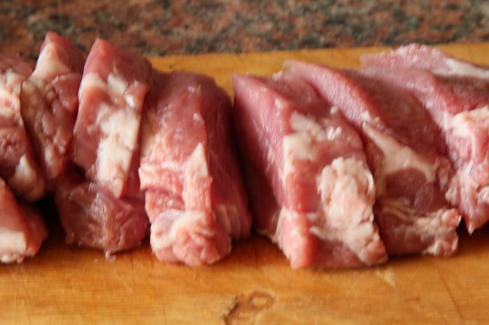 Нарезаем свиное филе на куски толщиной около 2 см.