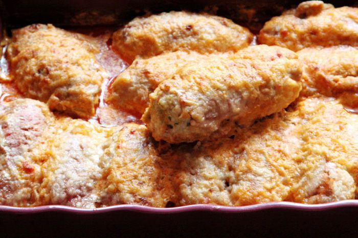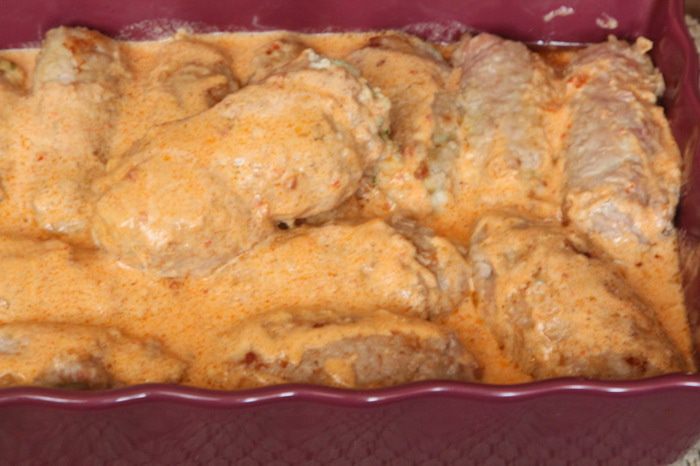 Готовим соус: сметану вместе с паприкой доводим до горячего состояния, поправляем по вкусу на соль и перец, добавляем миллилитров 100 воды, доводим до кипения. Крученики складываем в форму для запекания и заливаем их соусом.