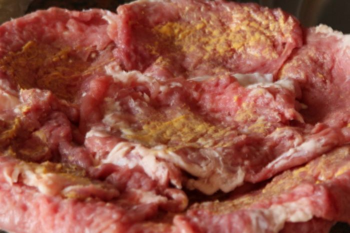Отбиваем тонко, намазываем горчицей, посыпаем молотым перцем и солью по вкусу и отставляем в сторону мариноваться.