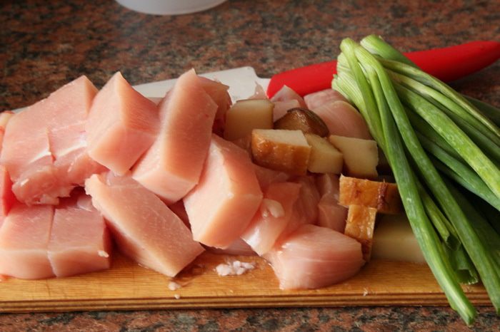 Куриное филе и сало режем кусочками, зеленый лук моем и чистим