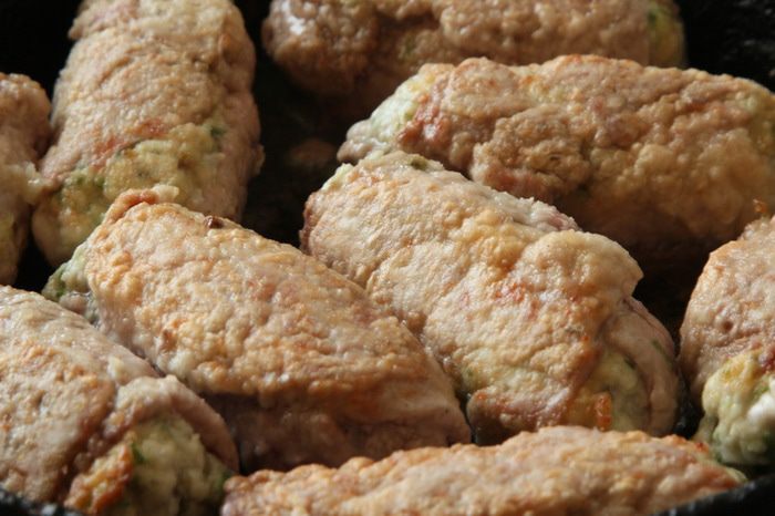 На сковороду с разогретым маслом кладем швом вниз и обжариваем до золотистой корочки. Не переживайте, крученик не раскроется.