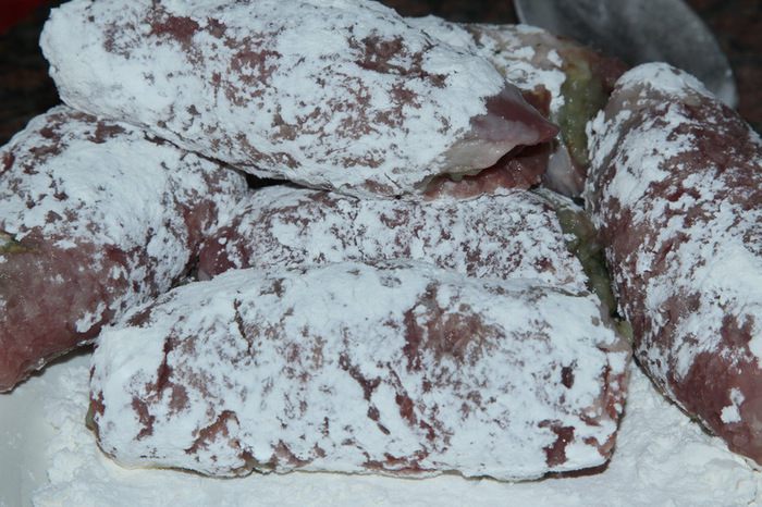 Затем хорошо обваливаем крученики в муке.