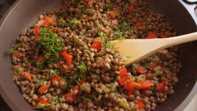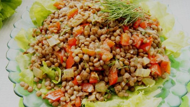 Этот салат может послужить полноценной заменой мясу в период поста, ведь чечевица очень богата растительным белком, который легко усваивается организмом и пищевыми волокнами.