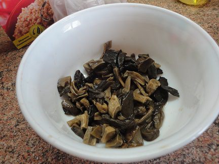 У меня грибы лесные, домашние (точнее из соседней области от сестрички). Я их замачиваю вначале на 30-60 минут, сливаю воду. Затем заливаю свежей водой (в данном случае 1 литр) и оставляю на ночь. Утром отвариваю в этой же воде 40 минут. Если кусочки большие, можно нарезать помельче.