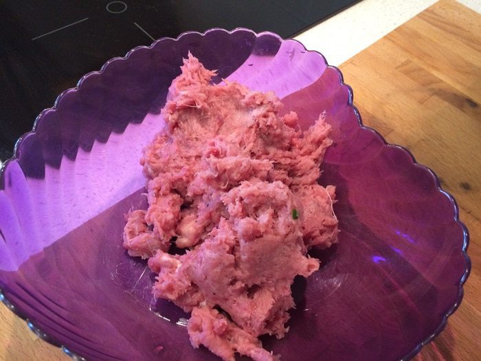 Филе индейки перемалываем в фарш. Добавляем соль, перец и молоко.