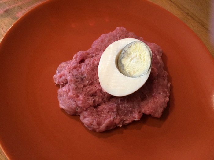 Делаем лепешечку, внутрь кладем половинку яйца или 1 перепелиное. И формируем котлетку.