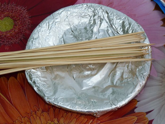 Тарелку обернуть пищевой пленкой. На даче ее в наличии не оказалось, поэтому я воспользовалась фольгой. Приготовить шпажки.