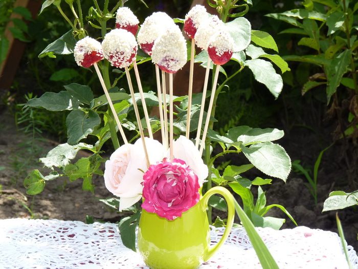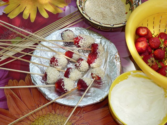 Каждую ягоду мокаем в йогурт, затем в кунжут, одеваем на шпажку и укладываем на тарелку.