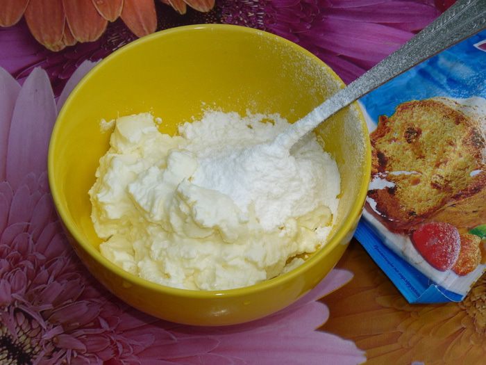 Йогурт (его можно заменить сметаной или мягким сыром) смешиваем с сахарной пудрой (количество по вкусу). У меня пудра уже с ароматом ванили, если у вас простая, то добавить щепотку ванильного сахара.