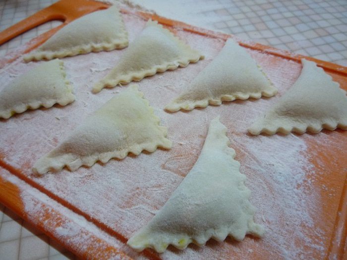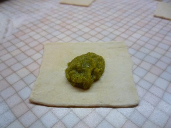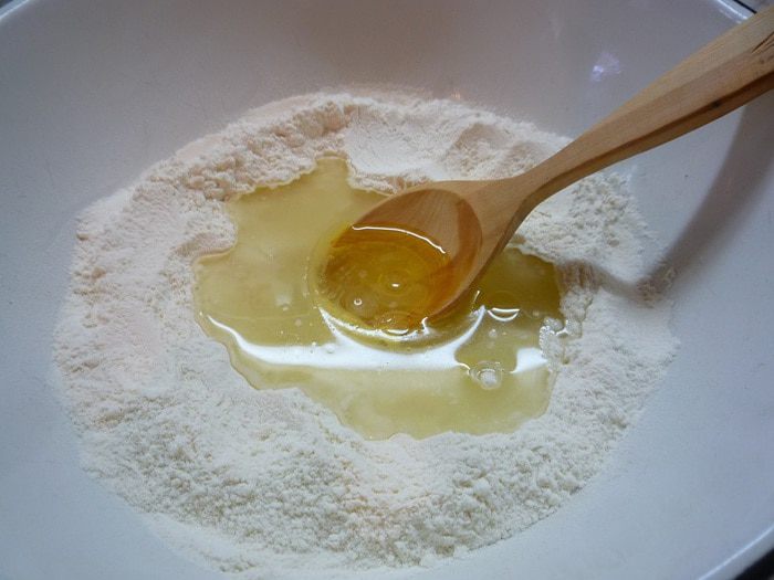 Готовим тесто: в чашку просеиваем муку, делаем посредине углубление, добавляем соль. Вливаем воду и оливковое масло. Замешиваем тесто.