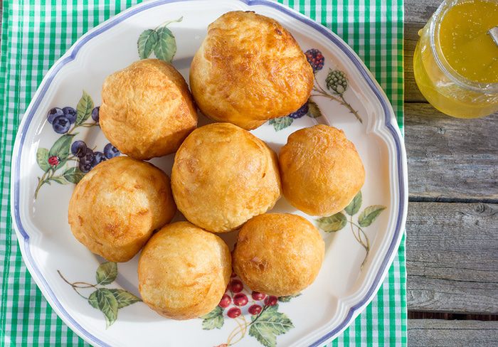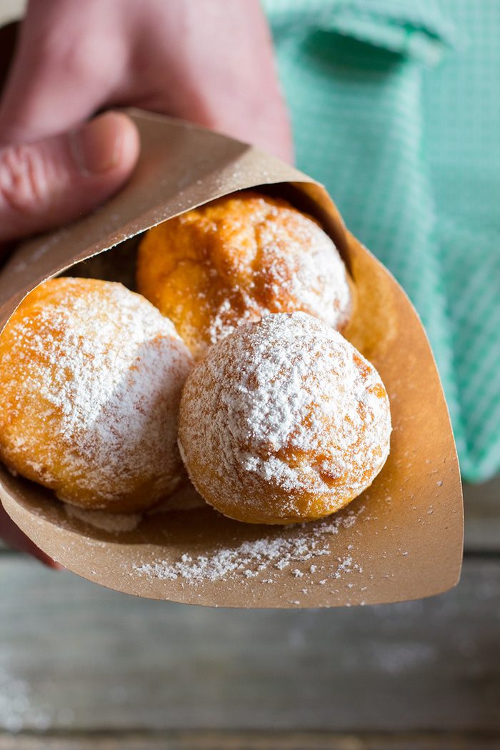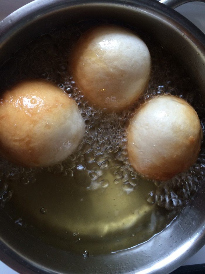 Разогрейте в сотейнике масло. Обомните тесто. Смазав ладони растительным маслом, возьмите небольшую порцию теста в левую руку. Сожмите так, чтобы в верхней части руки (между большим и указательным пальцами) образовался шарик размером с грецкий орех. Осторожно опустите шарик в кипящее масло. Обжаривайте кусочки теста в сотейнике 2-3 минуты или до появления золотистого цвета. Затем перекладывайте шумовкой на бумажные полотенца. Окуните горячие пончики в сироп.