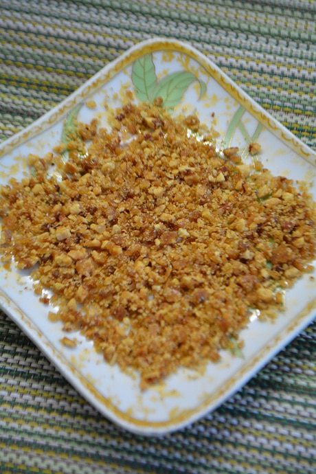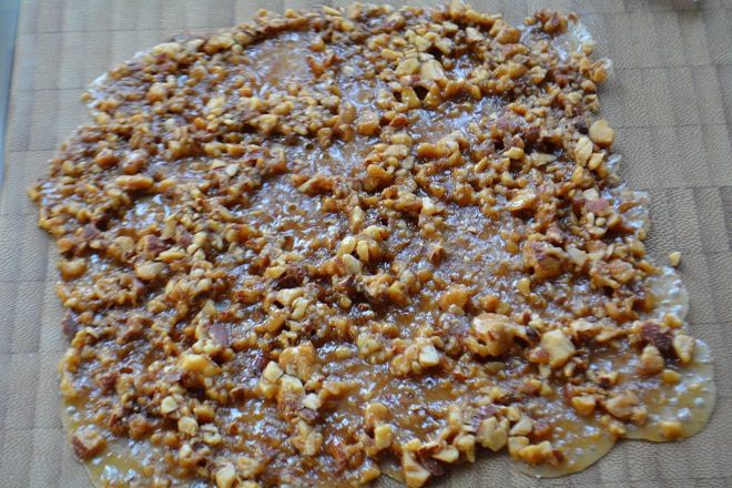 Для грильяжа я использовала готовую сухую карамель, ее смешала с измельченным миндалем. Высыпала на силиконовый коврик, разровняла и запекла при 190°C до золотистого цвета примерно 7-10 минут. Остудить. И снять с коврика. Если у вас нет готовой карамели, тогда в сотейник влить воду и всыпать 50 г сахара. Довести сироп до золотистого цвета. Всыпать поджаренные на сухой сковороде, измельченные орехи и перемешать, чтобы карамель покрыла все орехи. Пергамент смазать сливочным маслом и выложить орехово-карамельную смесь, разровнять. Остудить и готово!