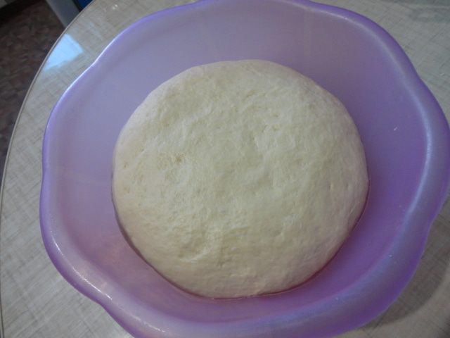 Тесто получается очень мягкое, нежное к рукам не прилипает. Миску с тестом прикрыть пищевой пленкой и оставить на 1 час. В теплом месте для расстойки. Час прошел, наше тесто хорошо поднялось.
