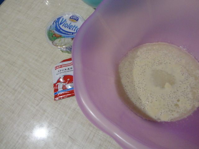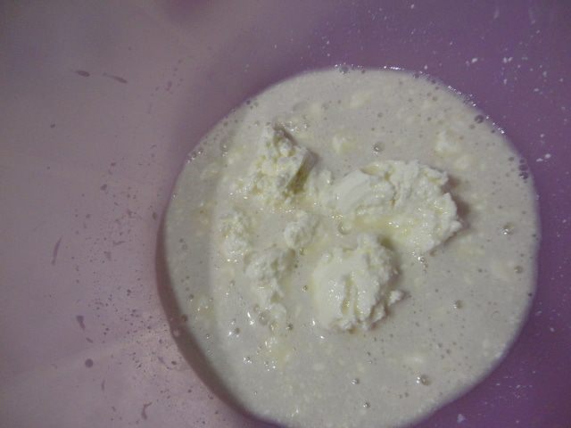 Затем добавляем творожный сыр, соль, муку и замешиваем тесто в конце добавляем растительное масло.
