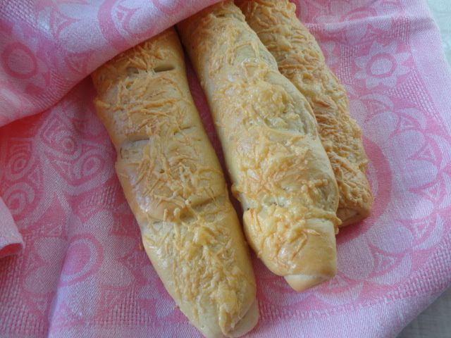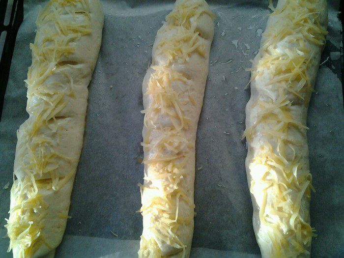 Уложили на противень, сделали надрезы, смазать яйцом, посыпать сыром накрыть пленкой и на расстойку где-то минут на 40. Выпекать в разогретой духовке при 180°C минут 30.