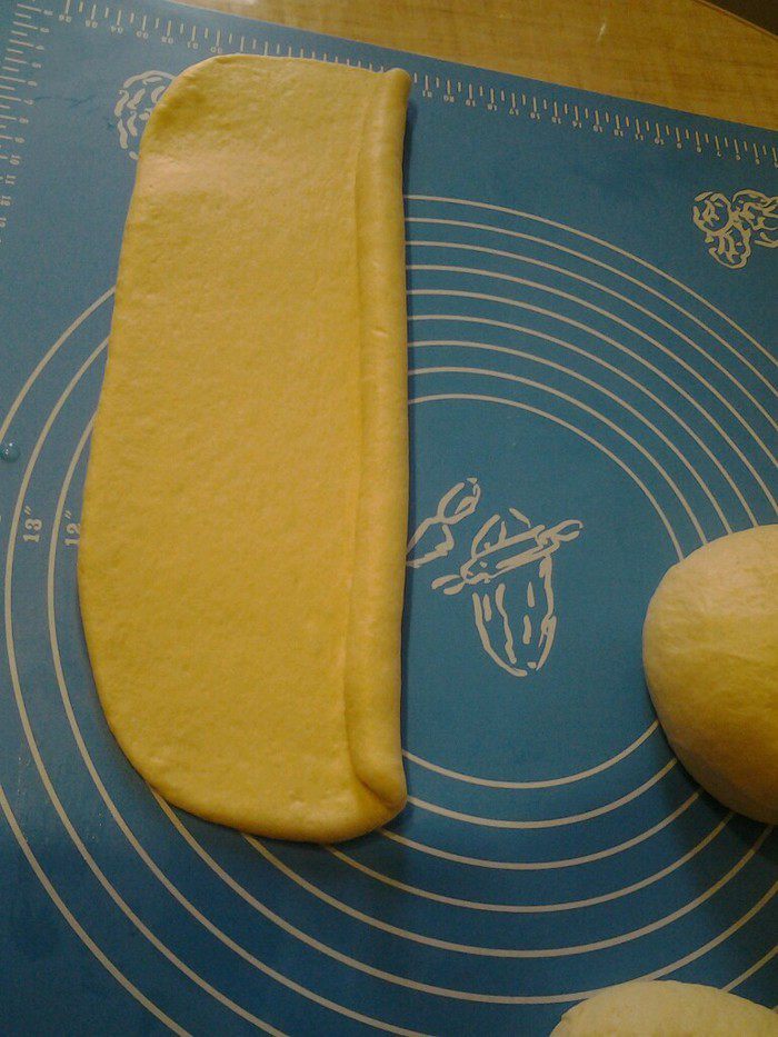 Выложить тесто на рабочую поверхность, сформировать колобки и начинаем раскатывать. Раскатали прямоугольник где-то 30х15 и свернули рулетиком.