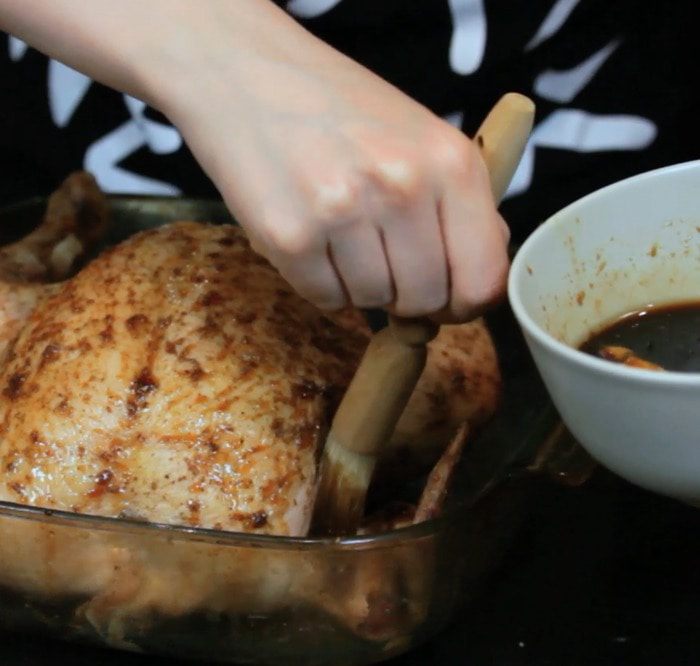 Для глазури смешать мед, соевый соус, кунжутное масло и имбирь. Увеличить температуру духовки до 205°С. Смазать курицу третью глазури и убрать в духовку на 10 минут. Затем смазать еще одной третью глазури и убрать снова на 10 минут.