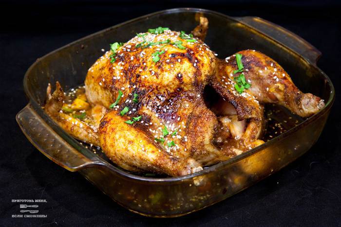 Проверить готовность курицы. Если курица готова, то смазать остатками глазури, посыпать луком и кунжутом. Блюдо готово.