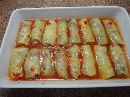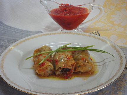 Запекайте в нагретой до 180°С духовке 35 минут. Готовые голубцы я ела с лютеницей.