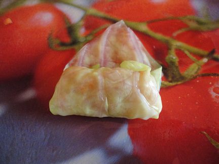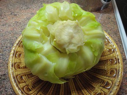 Капусту разделите на листья. Я делаю это так. В вилке делаю глубокие надрезы вдоль сердцевины и отвариваю в кипящей воде минут 5. Часть листьев начинают отделяться. Я их откладываю и, при необходимости, вилок опять отвариваю, чтобы отделились другие листья.