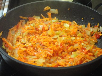 Лук мелко нарежьте и обжарьте на растительном масле до золотистого цвета. Морковь натрите на терке, чеснок измельчите и добавьте все к луку, потушите еще 2-3 минуты. Добавьте 2 ст. ложки кетчупа ( у меня кутчуп собственного приготовления) и потушите в течение 1 минуты.