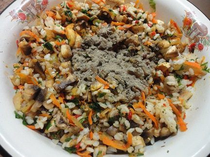 Соедините рис с грибами, жареными овощами, зеленью, солью, перцем и я еще добавила столовую ложку молотых на кофемолке сухих лесных грибов.