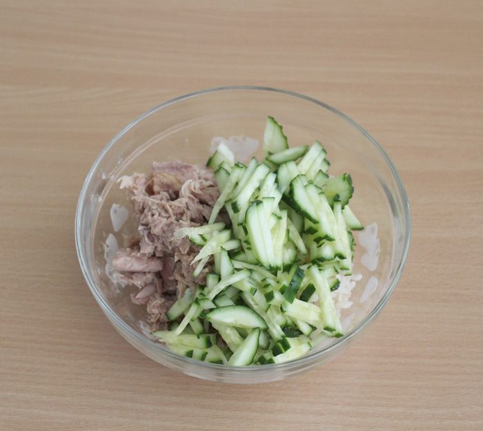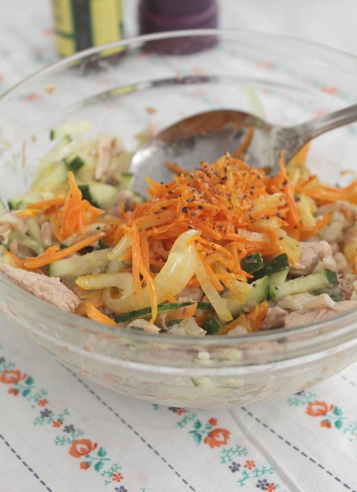 Бурый рис доливаем водой, чтобы она покрывала рис примерно на 0,5-0,7 см. Варим рис на медленном огне до готовности (не забываем подливать воду по мере впитывания). После того как рис готов, поливаем его лимонным соком (1-2 ч. л.), накрываем крышкой, даем остыть.