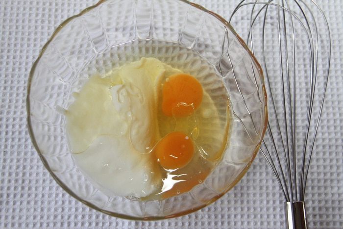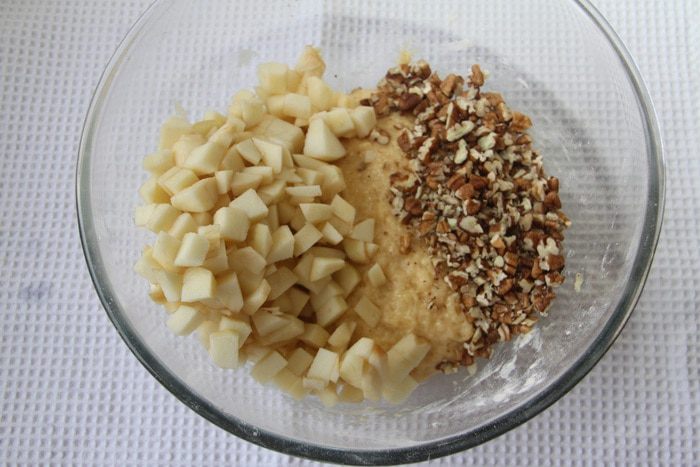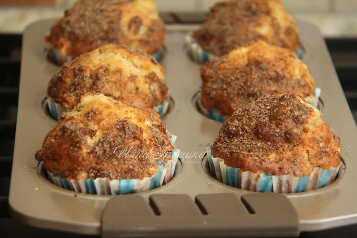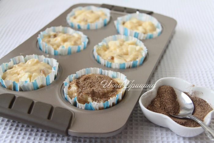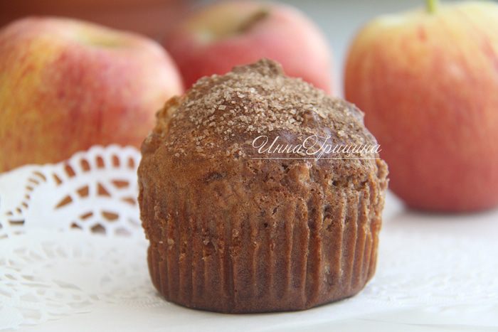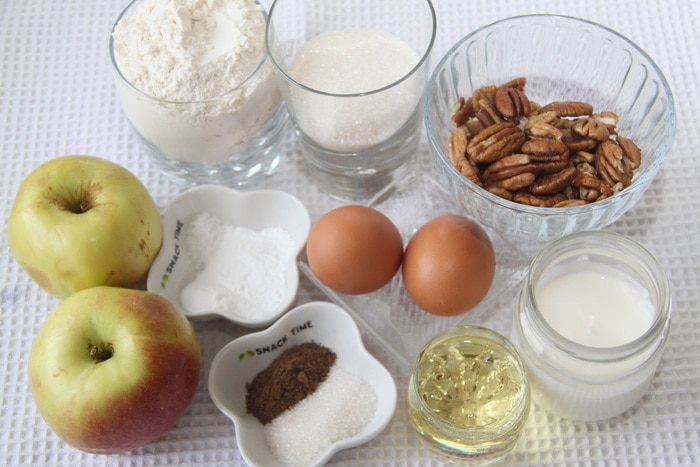 Понадобятся 2 яблока, 250 г муки, 100 г сахара, 2 ч.л. разрыхлителя, 1/2 ч. л. соды, 1/2 ч. л. соли, 100 г йогурта, 60 мл растительного масла, щепотка ванилина, 2 яйца, а также 50 г орехов (пекан или грецких), для сахарной коричной корочки 1 ст.л. сахара и 1 ч.л. корицы.