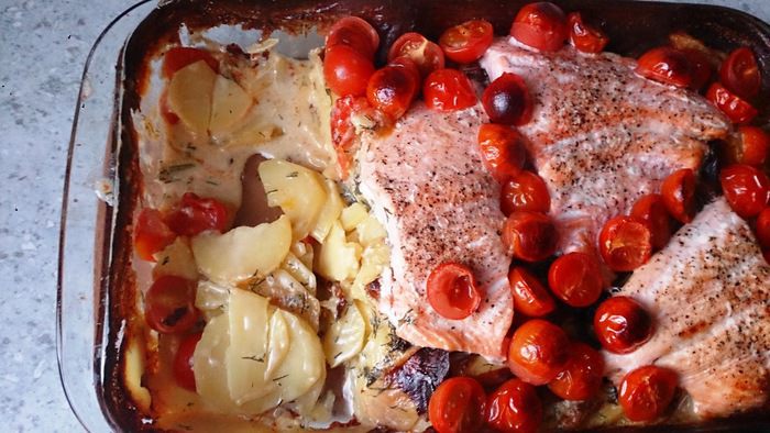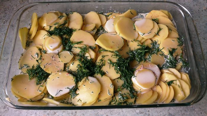 Укроп мелко порубить, перемешать с молоком и сливками. Картофель почистить, помыть и нарезать кружочками. Чеснок почистить, разрезать вдоль напополам и обмазать форму для запекания. Дополнительно форму смазать маслом. Выложить картофель приправив солью и мускатным орехом, залить молочной смесью.