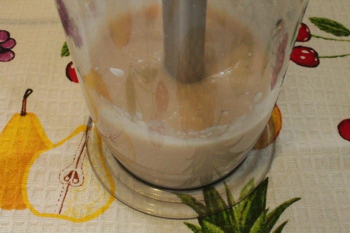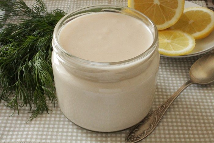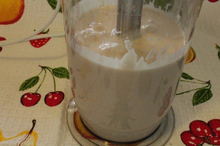 Добавить в три приема растительное масло, взбить до однородной смеси. Соус загустеет и приобретет белый цвет.