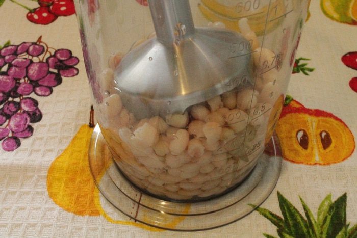 Фасоль поместить в стакан блендера, добавить уксус, минеральную воду, горчицу, соль и сахар.
