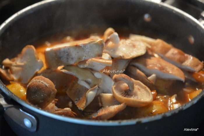 Добавим очищенные и нарезанные грибы, если они крупные, майоран. Готовим 20 минут.