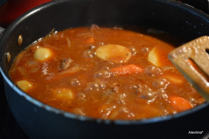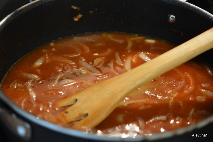 Добавить томатный соус, красное вино. Довести до кипения и добавить коричневый сахар, мясной бульон, говядину с тарелки. Закрыть крышкой и тушить на медленном огне 1,5 часа.