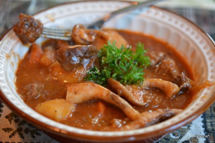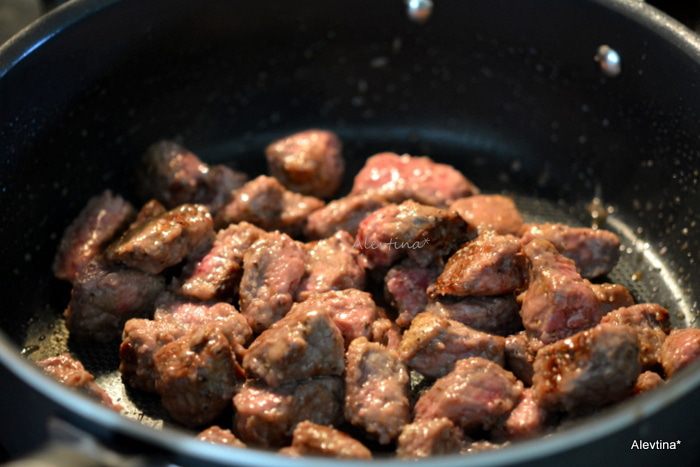Растопить масло 4 ст. л. Обжарить кусочки говядины до коричневого цвета. Переложить на тарелку.