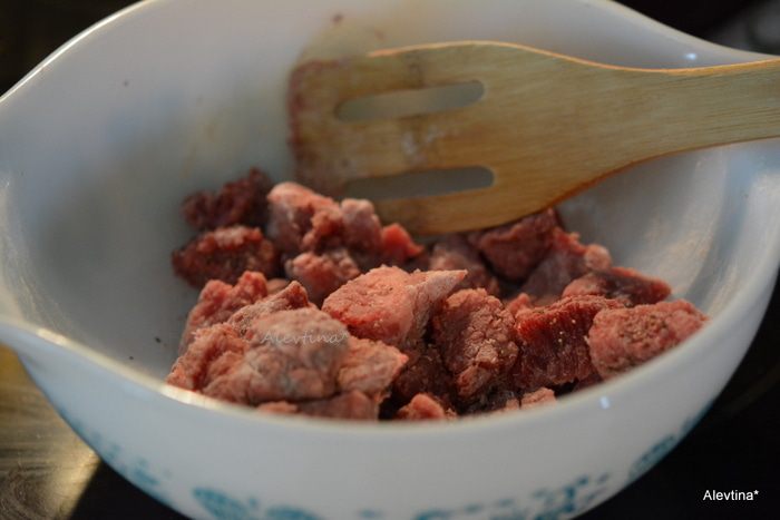 Мясо говяжье часть шейная порезать кубиками. Обвалять в муке, посолить и поперчить.