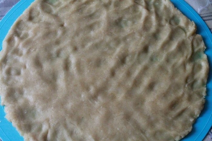 Раскатываем тесто в большую круглую лепешку. У меня получилась лепешка размером 26 см в диамтре.