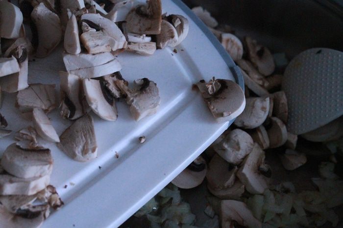 Тем временем обжариваем грибы с луком. Подсаливаем по вкусу.
