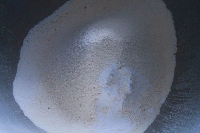 Для теста смешиваем муку с разрыхлителем и солью