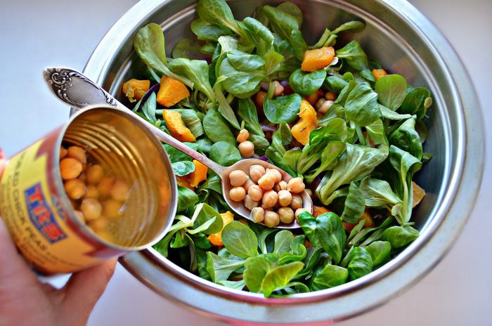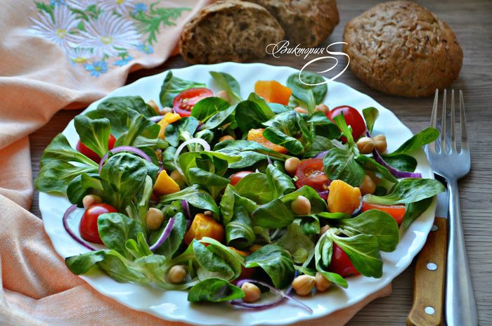Салат корн помыть, просушить. В миске смешать салат, запеченную тыкву, лук, помидоры, добавить консервированный нут. Немного приправить салат солью, бальзамическим уксусом, сбрызнуть оливковым маслом и хорошо перемешайте.