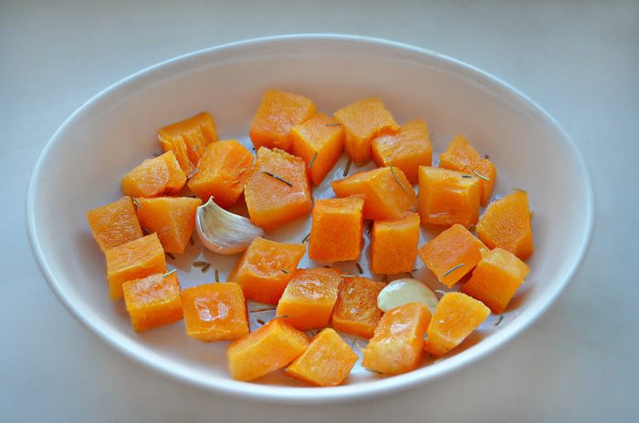 Тыкву помыть, почистить и нарезать на небольшие кусочки. Уложить тыкву вместе с зубчиками чеснока (можно не чищенные) в форму для запекания, сбрызнуть оливковым маслом, посыпать розмарином и запекать при 180°C до готовности. У меня этот процесс занял 25 мин.