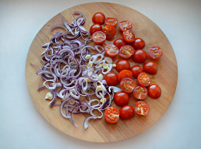 Лук почистить, нарезать тонкими полукольцами. Помидоры помыть и разрезать пополам.
