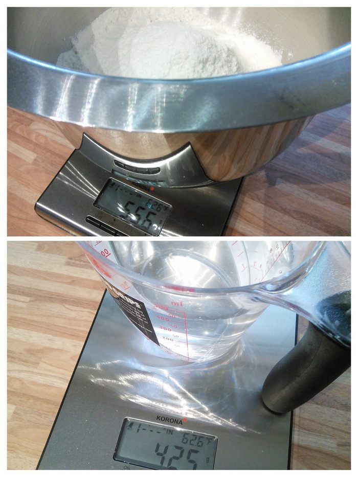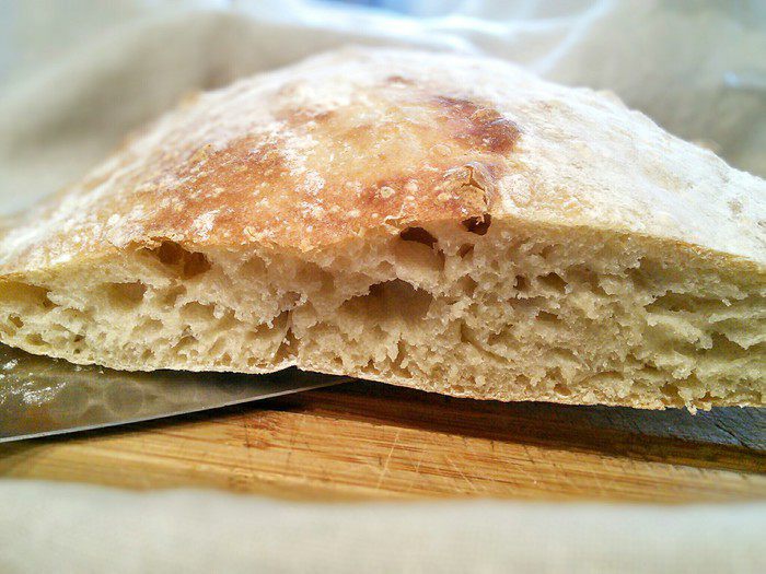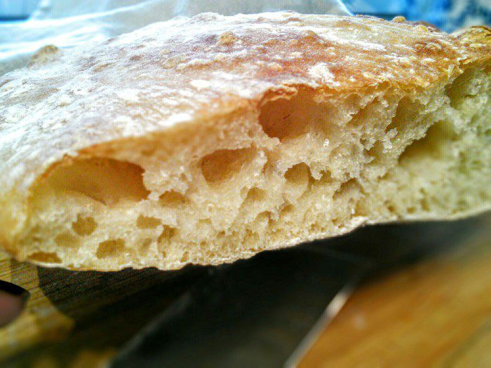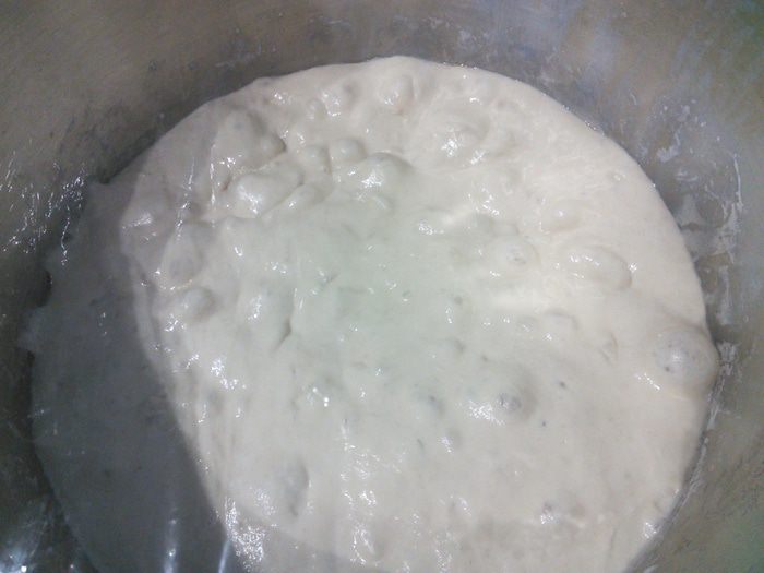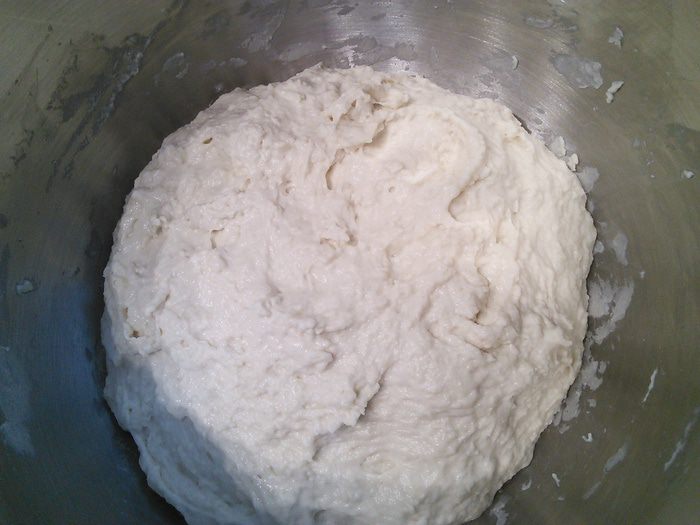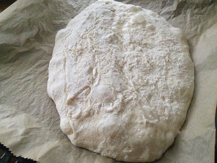 Перенести очень аккуратно тесто на противень, (просто дать ему сползти на противень, помогая лопаточкой). Тут нужно было сформировать буханку, но тесто оказалось жидковато. Поэтому я не заморачиваясь, оставила всё как есть и у меня получилось что-то среднее между хлебом и чиабаттой.