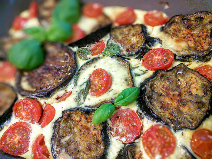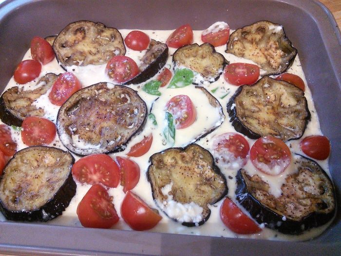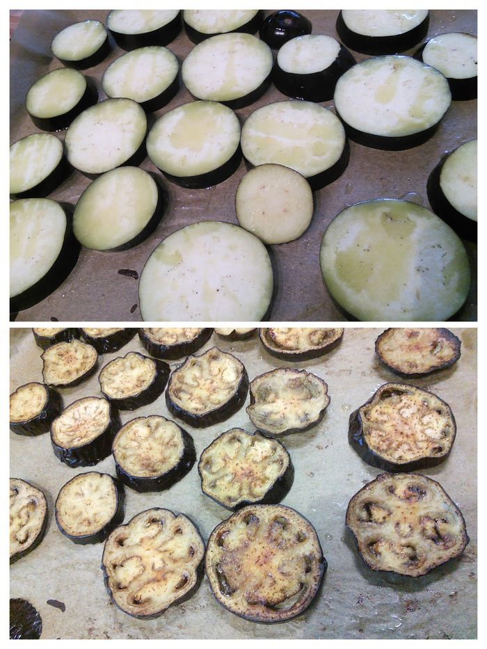Баклажаны (крупные) помыть, порезать кольцами примерно в 2 см шириной. Выложить на противень, покрытый пекарской, смазать оливковым маслом с обеих сторон и запечь в заранее разогретой до 200°С духовке приблизительно 40 мин., в середине времени аккуратно перевернуть кольца баклажан на другую сторону. Баклажаны приобретут золотистый цвет, вынуть противень и полностью охладить.