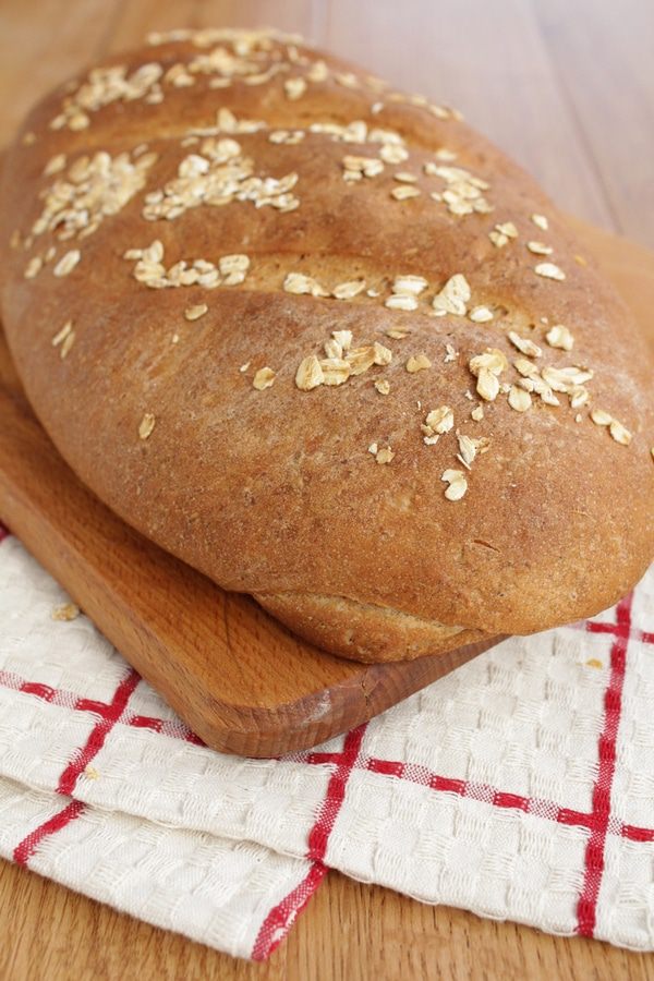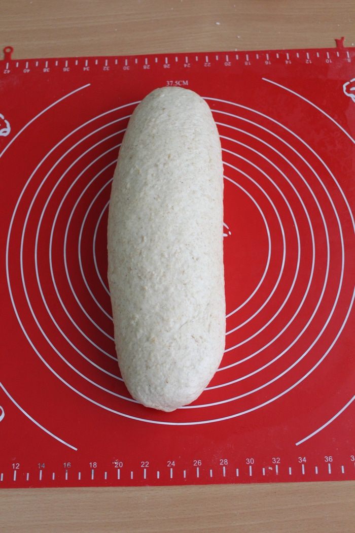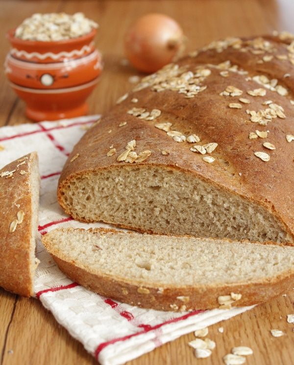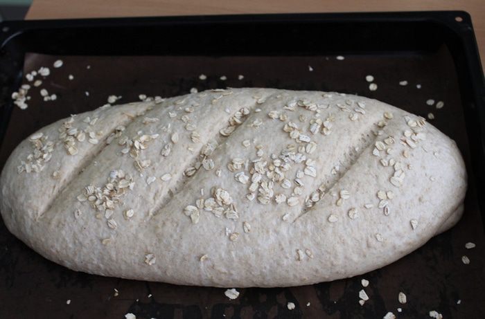 Потом придать хлебу овальную форму, побрызгать водой и посыпать овсяными хлопьями.