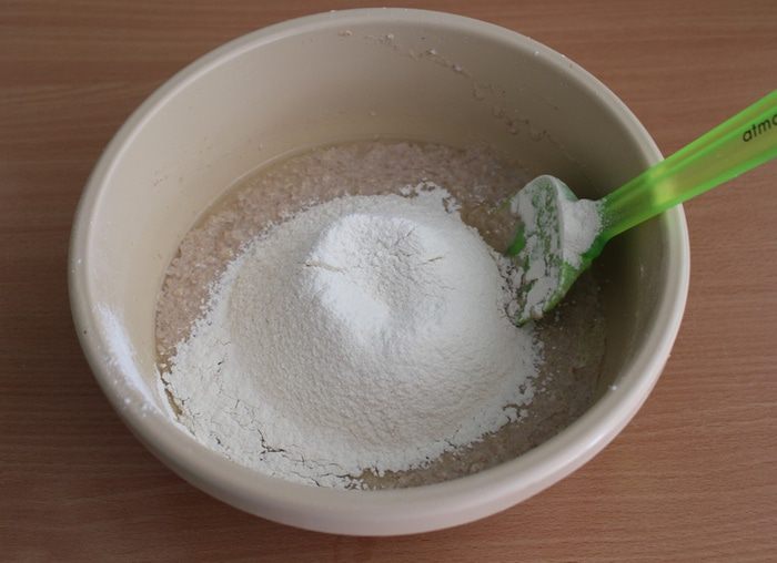Затем добавить цельнозерновую муку, перемешать.