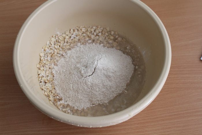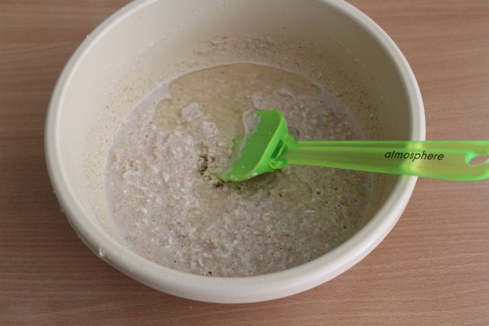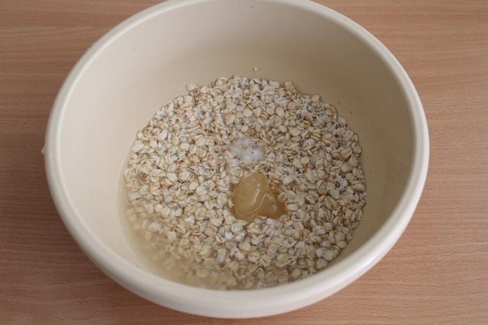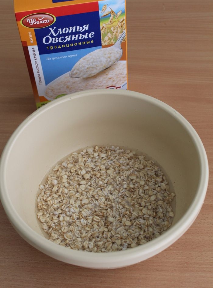 Овсяные хлопья замочить в тёплой воде на минут 20.