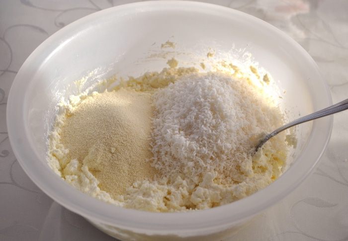 Затем добавляем манку и кокосовую стружку, перемешиваем.