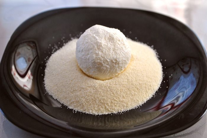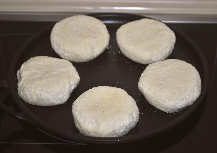 В тарелку насыпаем манку 4-5 ст. л. (ее количество не указано в ингредиентах). Мокрыми руками формируем небольшой шарик, кладем его в манку и прижимаем рукой, что бы получилась лепешка средней толщины. Переворачиваем на другую сторону.
