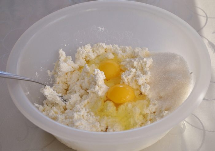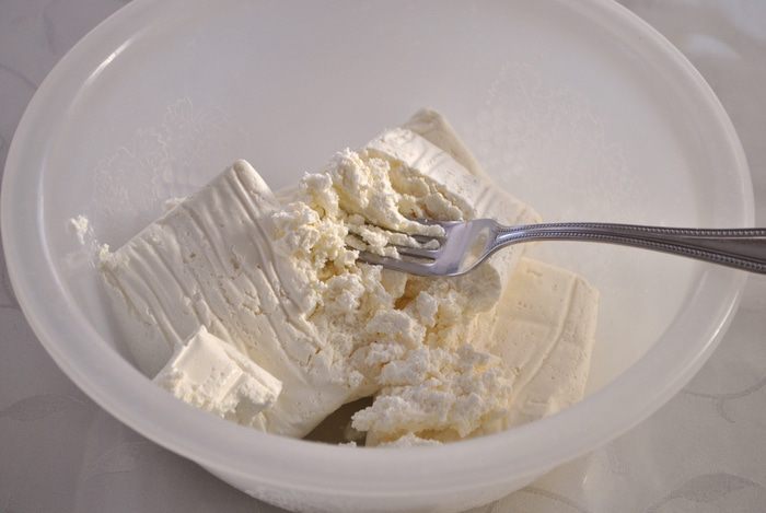Творог разминаем вилкой.