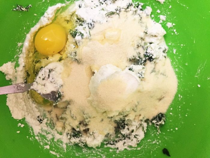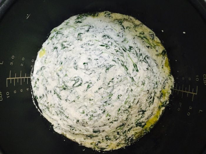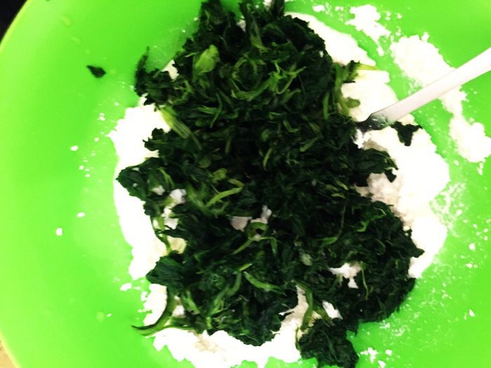 Подготовьте все ингредиенты и заранее разморозить шпинат (вес указан в замороженном состоянии). Творог измельчите ложкой и перемешайте. Добавьте размороженный шпинат (удалив всю жидкость от разморозки). Все перемешать.